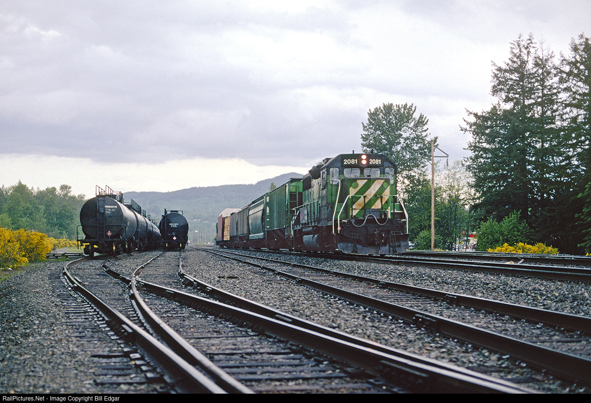 | BN 2081 is at Gold Bar, WA with a turn that originated in Everett and can operate as far east as Skykomish when needed. The yard at Gold Bar is used for car storage at times, and in this case was storing tank cars. |