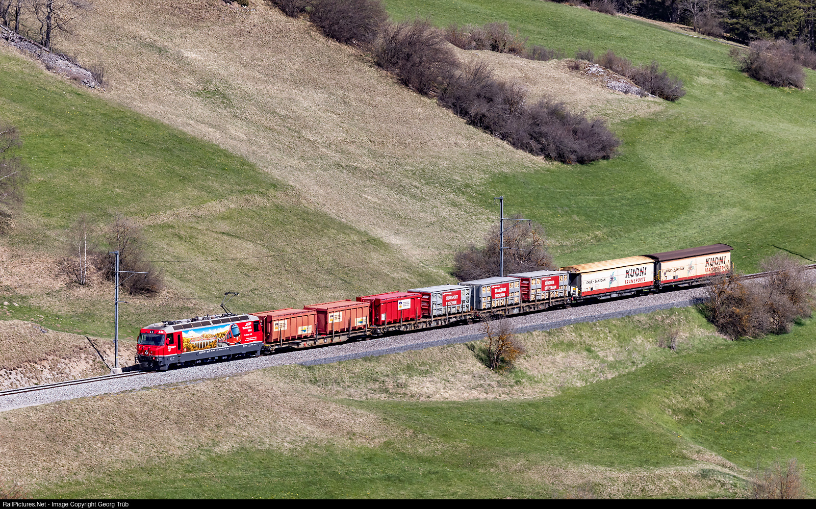 | The Ge 4/4 III # 644 of the Rhaetian Railway has a publicity paint scheme (adhesives) for the world record attempt of the longest narrow gauge passenger train. When the locomotive was presented to the media in june 2022, the words were: "World record trial". Since the record was achieved on october 29th, 2022, the words on the locomotive now say: "World record run". The locomotive pulls the freigh train 5152 from Samedan over the Albula line to Landquart freight yard between Surava and Tiefencastel. |
