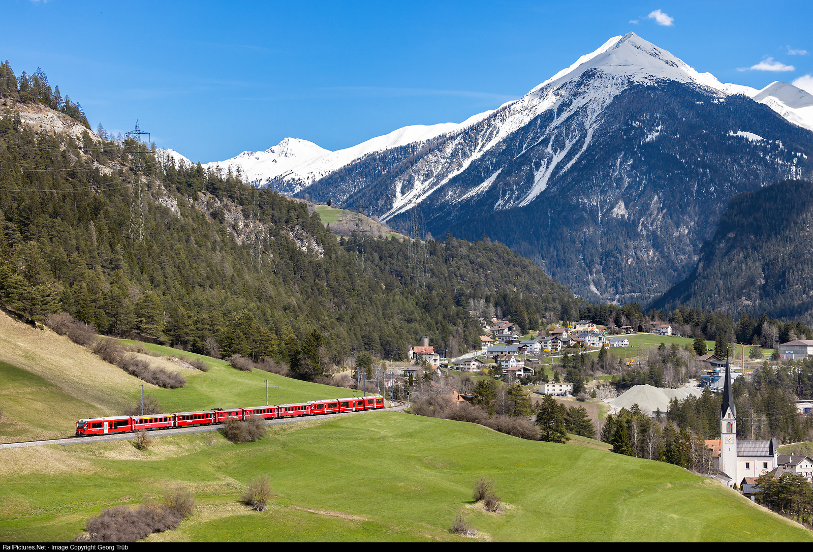 In the past few days there has been a fair amount of fresh snow at higher altitudes, while in the valley the meadows are already quite green. The Interregio 1141 of the Rhaetian Railway from Chur via the Albula line to St.Moritz is traveling uphill between Tiefencastel and Surava. This is today a replacement train with "Allegra" ABe 8/12 # 3501, standard cars type II, a baggage car and a modern driving trailer Bt # 52806 at the end of the train. Whenever one of the 6 ALVRA trains is under maintenance or repair, the RhB has to use such a non-air-conditioned replacement train. In the background, the snow-covered mountains Aelplihorn and Muchetta can be seen.