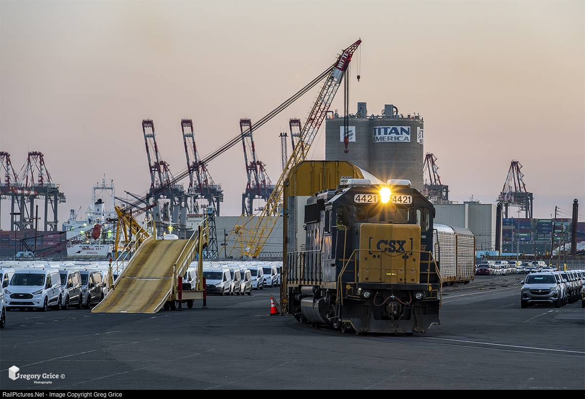 As the sun sets on April 13th, 2023, Conrail Shared Assets PN20 pulls a small cut of autoracks from the Foreign Automotive Preparation Service (FAPS) terminal in Port Newark, NJ.