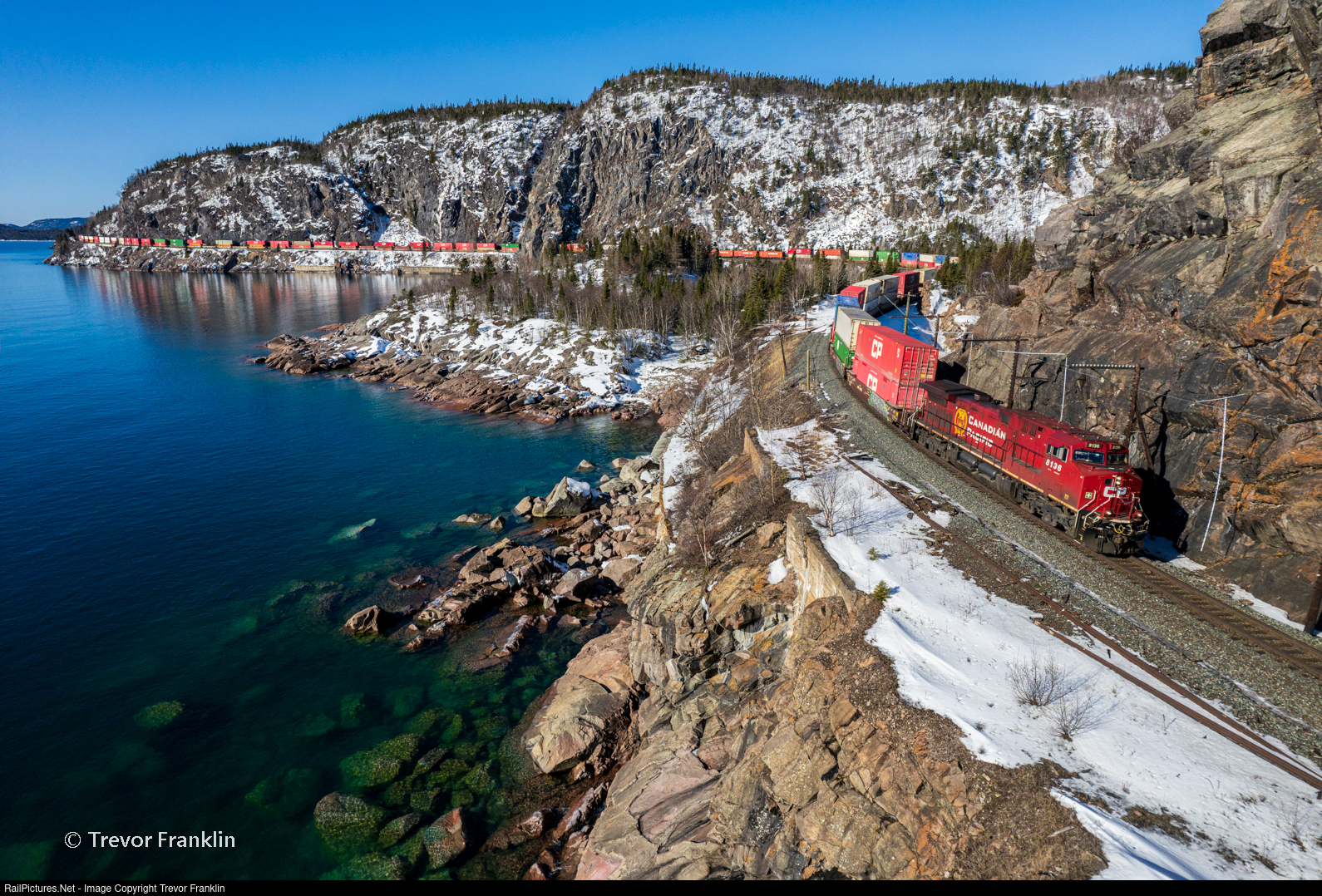 | Livin' on the edge. A beautiful winter's morning on the north shore of Lake Superior welcomes 100's train with its 10,000+ft of stacks in tow, winding around picturesque Mink Harbour. They'll have nothing but clear signals and clear skies all the way to White River with 113 parked in the hole at Marathon waiting for them. |