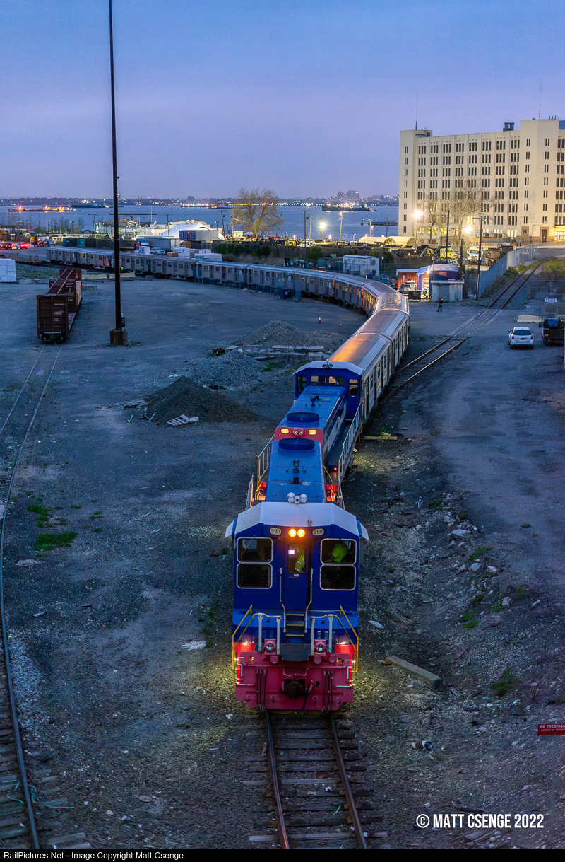 NYNJ Rail SE10B no. 5101 (KLW, 2015-present) is seen on the end of a string of 12 New York City Transit Authority (NYCTA) R32 cars (Budd, 1964-1965) that are being sent to scrap. |