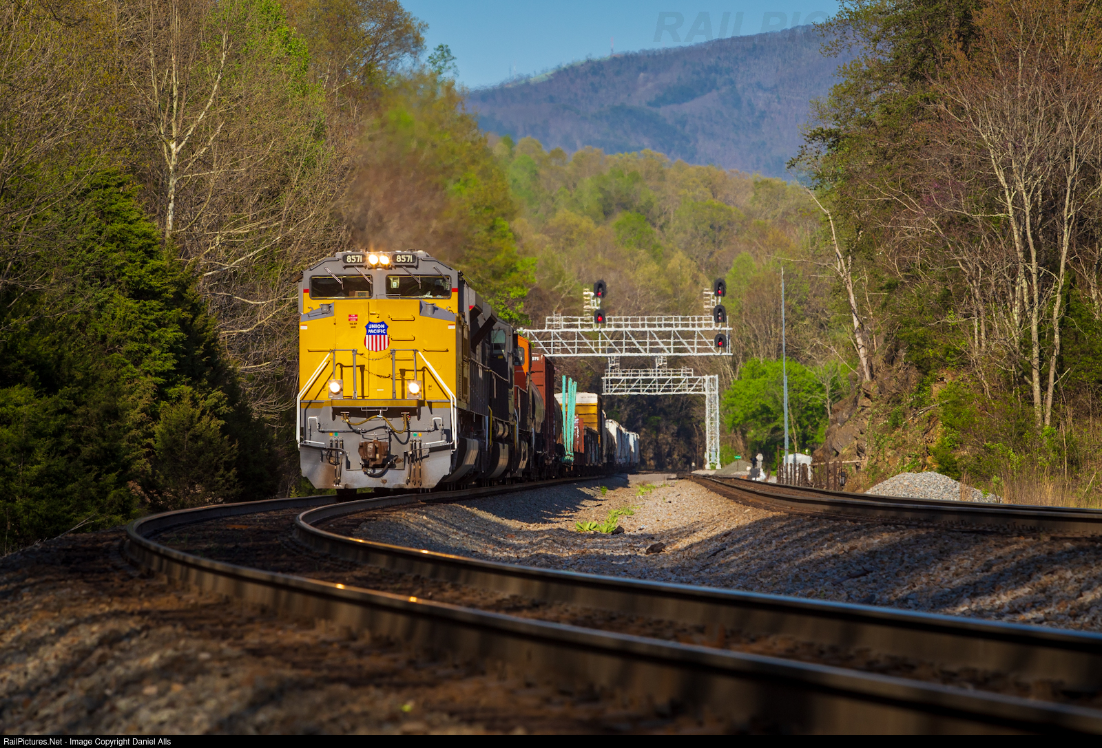 | A UP ACe, in its brand new paint scheme, pulls NS 13z through control point Arthur in Shawsville, VA. |