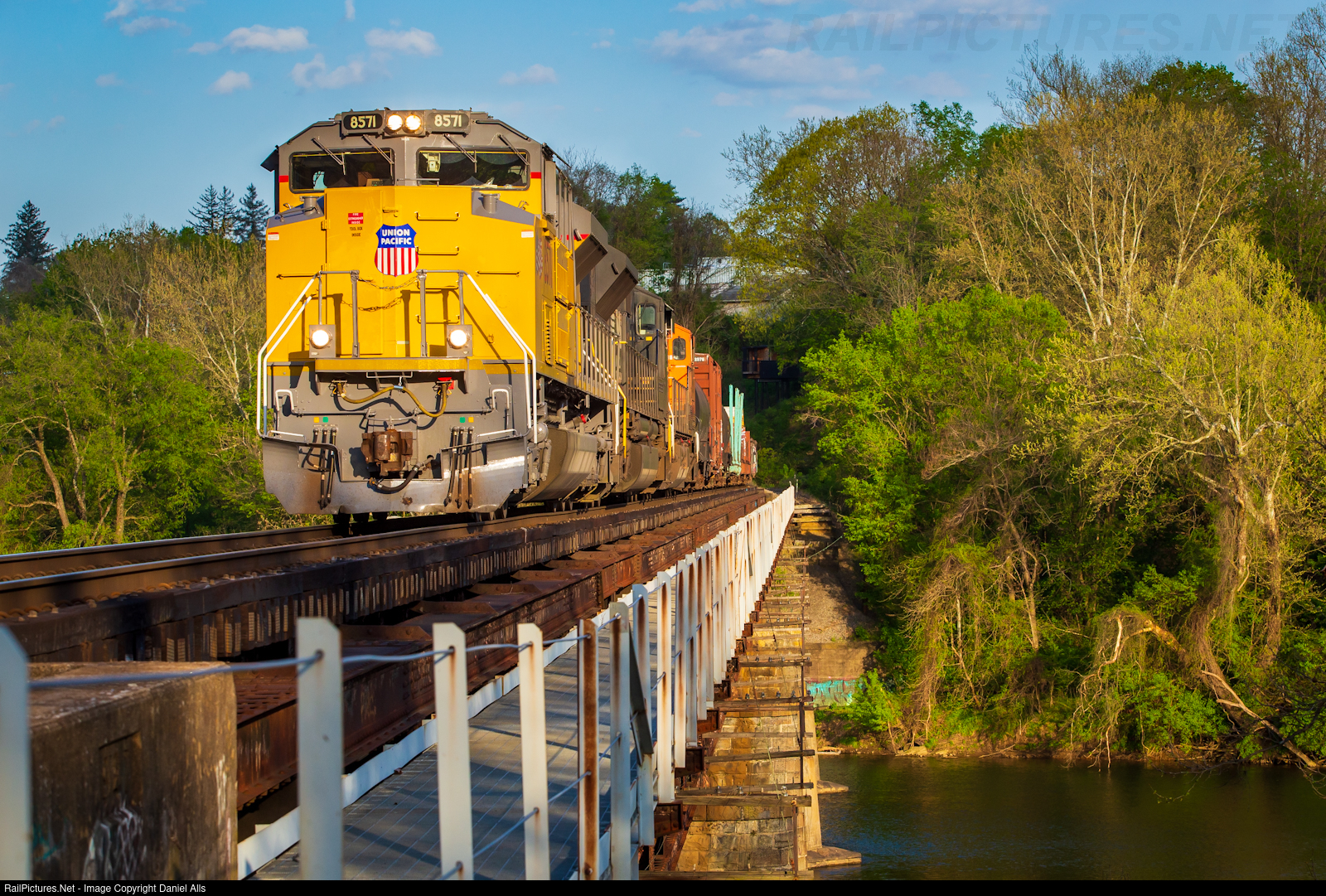 | A UP ACe, in its brand new paint scheme, pulls NS 13z west over the New River in Radford, VA on the Pulaski district. |