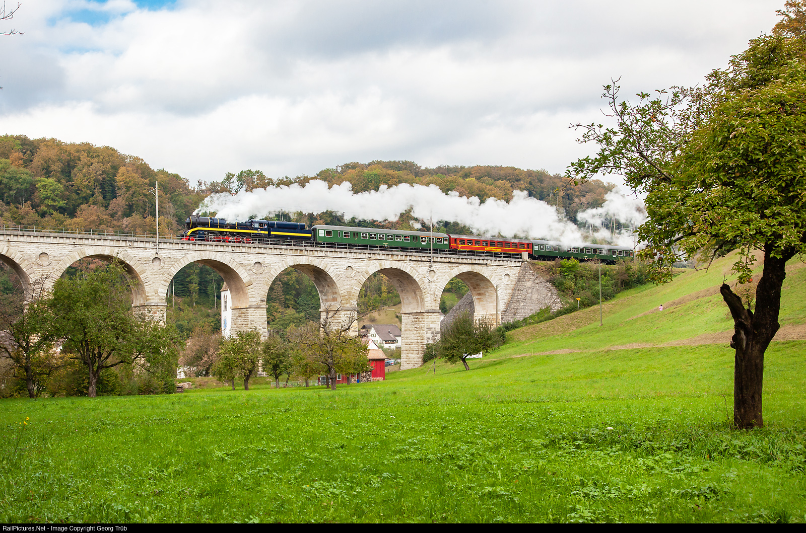 | Lightoil fired 2-10-0 steamlocomotive 52 # 8055 of the Dampflokomotiv und Machinenfabrik DLM AG was pulling daily steamtrains on the Hauenstein line Sissach-Läufelfingen-Olten for two weeks in october 2009. The morning train is crossing the 25 metre high Rümlingen viaduct, one of the oldest railway viaducts in Switzerland, dating from 1856. |