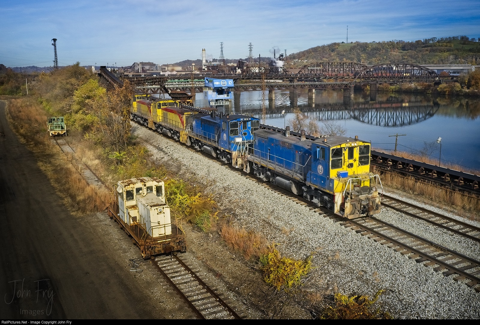 | A union railroad train crosses the Monongahela river with empty coke hoppers and coil cars in East Pittsburgh past a couple of critters hiding in the weeds. The green and yellow 45 ton in the back is/was a Turtle Creek Industrial loco, and I believe the unit in the foreground is a National Steel loco. |
