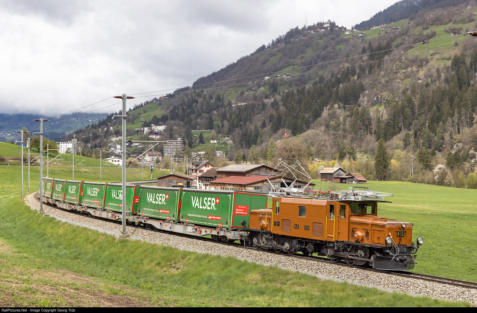 | For locomotive driver instruction purposes, the "Valser" water train 5732 from Ilanz to Untervaz-Landquart freight station was led by locomotive Ge 6/6 I (known as C-C or Rhaetian Crocodile) # 415 built in 1929. The train with 8 loaded "Valser" swap bodies is on its way between Ilanz and Castrisch. Locomotive 415 was in the special Chameleon or Flip Flop paint scheme last year, but now in the original brown color again. On the right on the mountain slope is the church of Sogn Gieri in Ruschein visible. |