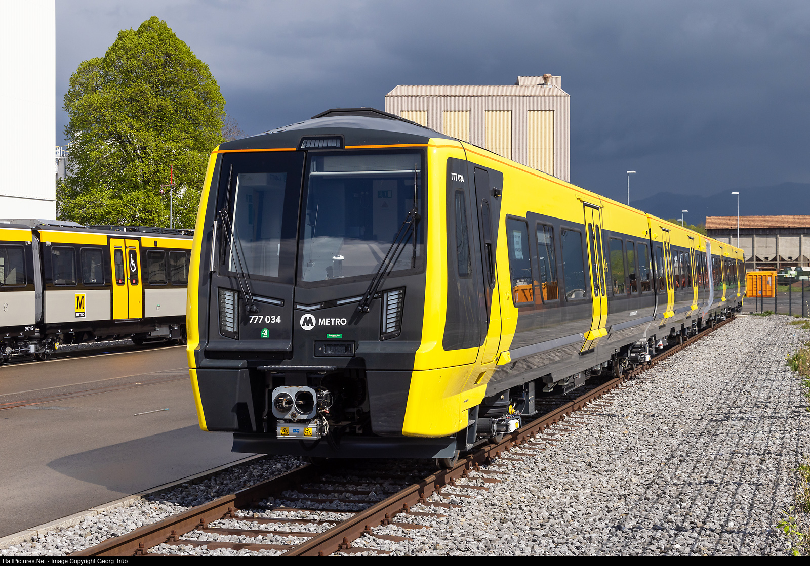 | Class 777 # 034 "Metro" train for the Merseyrail in front of the StadlerRail St.Margrethen plant. The British Rail Class 777 METRO is a class of electric multiple unit passenger trains currently under construction by Swiss rolling stock manufacturer Stadler Rail, being used on the Merseyrail network in the Liverpool City Region and adjacent areas of Cheshire and Lancashire. They run with 750 V DC third rail, have a maximum velocity of 75 mph (120 km/h) and a starting acceleration of 1.1 m/s2 (3.6 ft/s2). 46 of this trains will be built, and 7 more with aditional battery traction (class 777/1) |