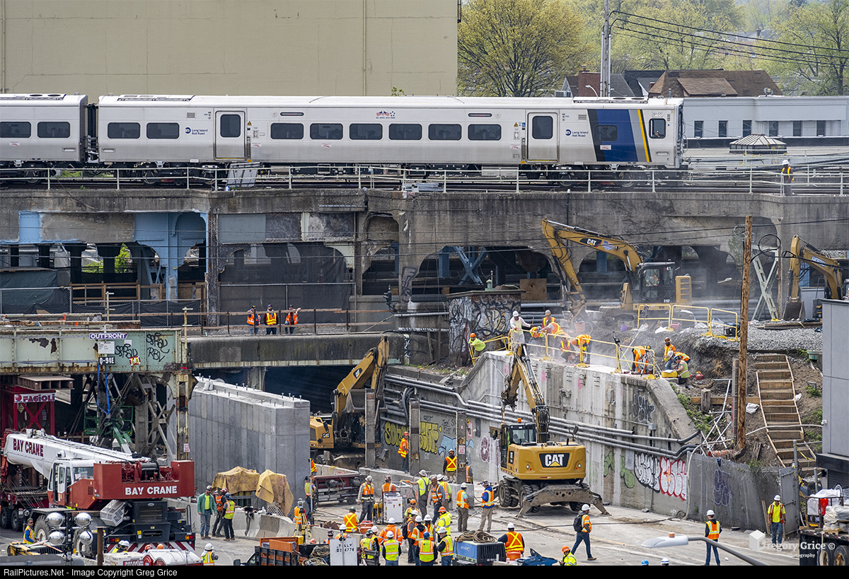 On the morning of April 23rd, 2023, the engineer of a passing Long Island Rail Road train looks on as crews work below to prep concrete supports for one of the new Van Wyck Expressway ML 1/3 Rail Bridge spans.