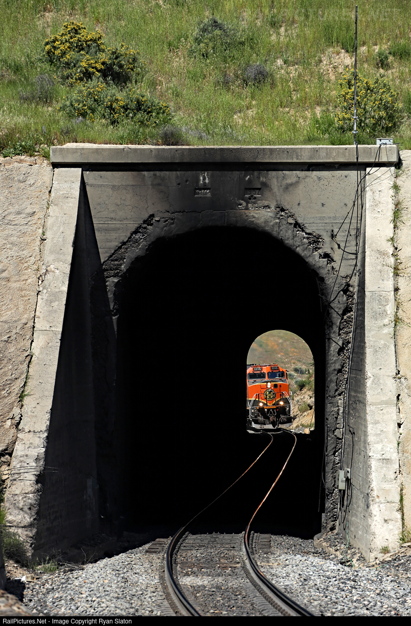 Leaving Bealville and getting its first look at Clear Creek Ravine, an eastbound empty grain shuttle, led by 'goat boat' C44-9W 1115, peaks through 494' long tunnel 3.