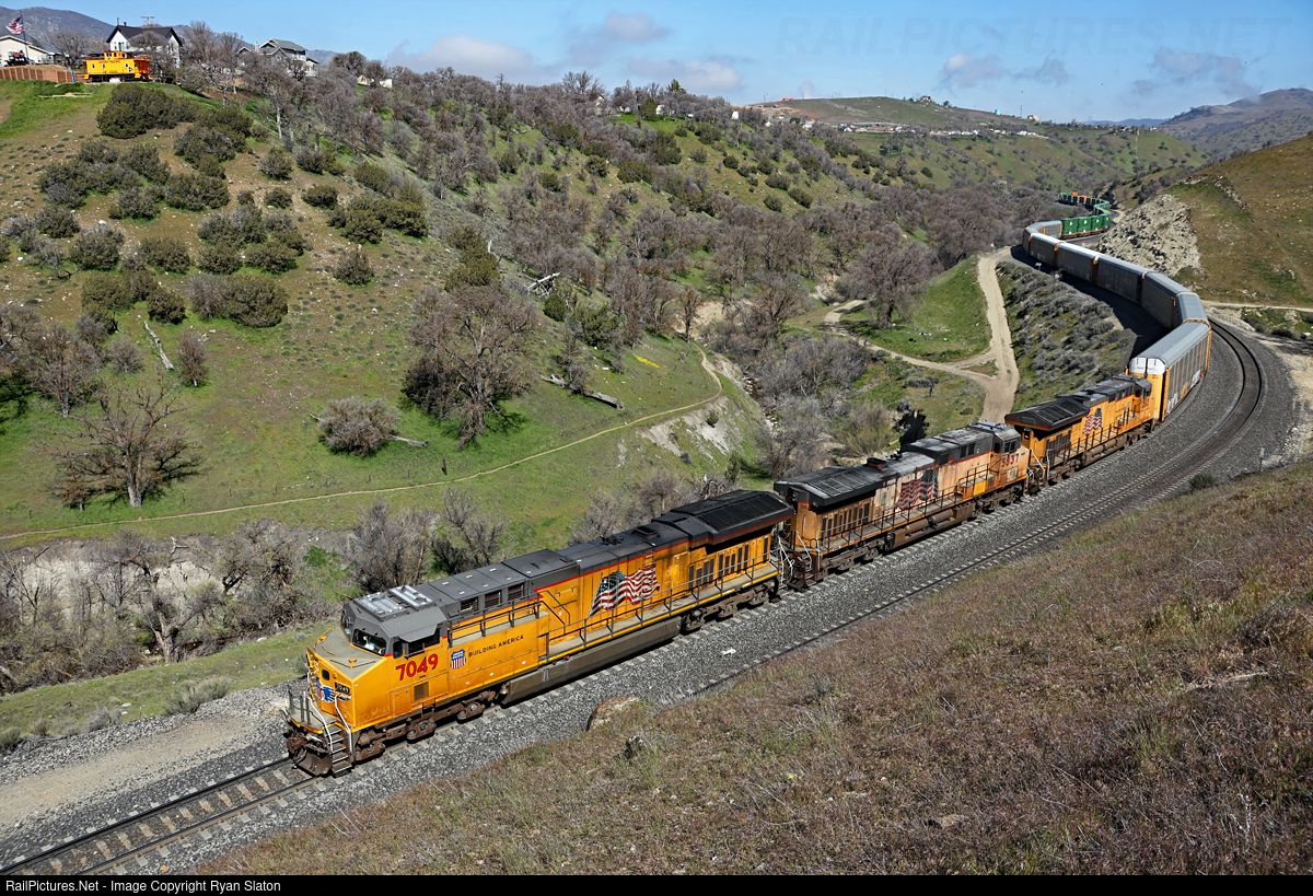 | A trio of GEs, led by 'big 6' rebuild 7049, power through the curves at Cable with an eastbound. Note the very nicely restored former Union Pacific caboose that is now on display in someone's backyard at upper left. |