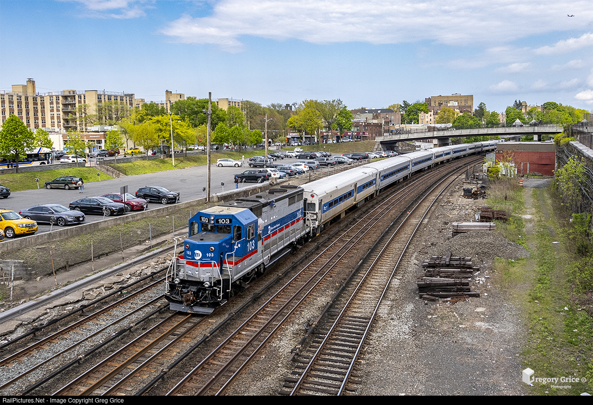 On the afternoon of April 26th, 2023, Metro-North Railroad's "AMMO" crew, with EMD GP35r 103 in the lead, is seen towing a disabled diesel set past the former site of the NYNH&H Mount Vernon (Prospect Avenue) station, now August Petrillo Plaza on the New Haven Line. The old concrete platform is visible to the left of the train.