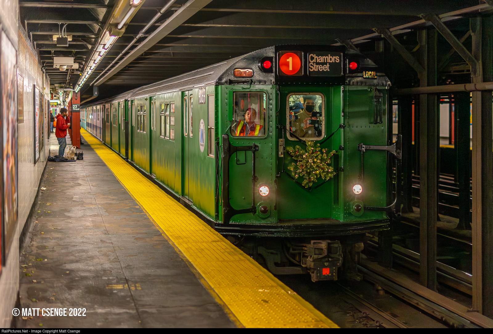 R33 no. 9069 (St. Louis Car Co., 1962-1963) is the lead motor on the NY Transit Museum's Holiday Nostalgia Train as it arrives at 23rd St Station.