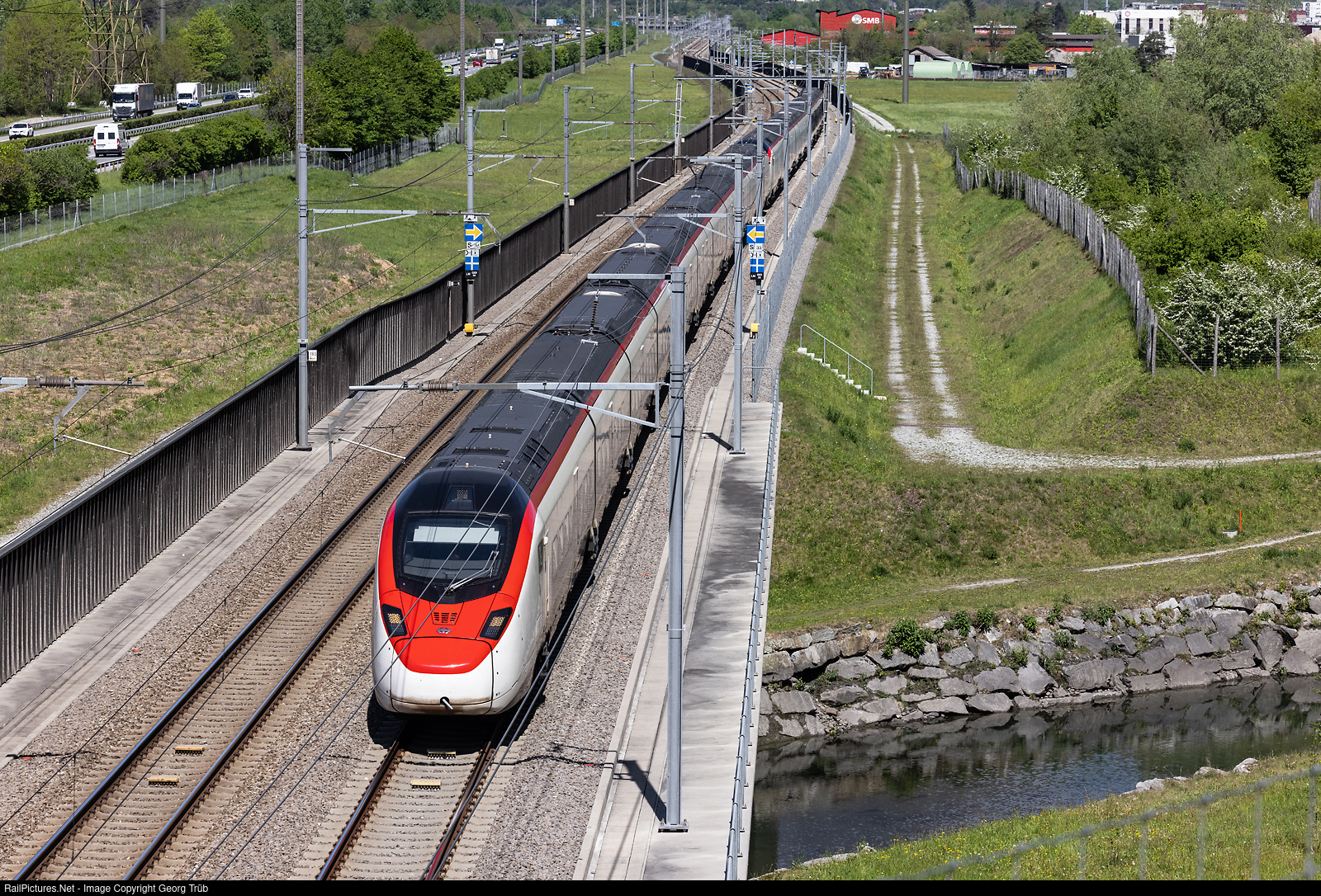 | Two Giruno highspeed trains RABe 501 of the SBB in multiple control are running the Eurocity 327 from Zürich to Genova Porta Principe via Bellinzona-Lugano-Milano Rogoredo, on the Gotthard Base tunnel line bypassing Biasca in the Ticino, near Giustizia. |