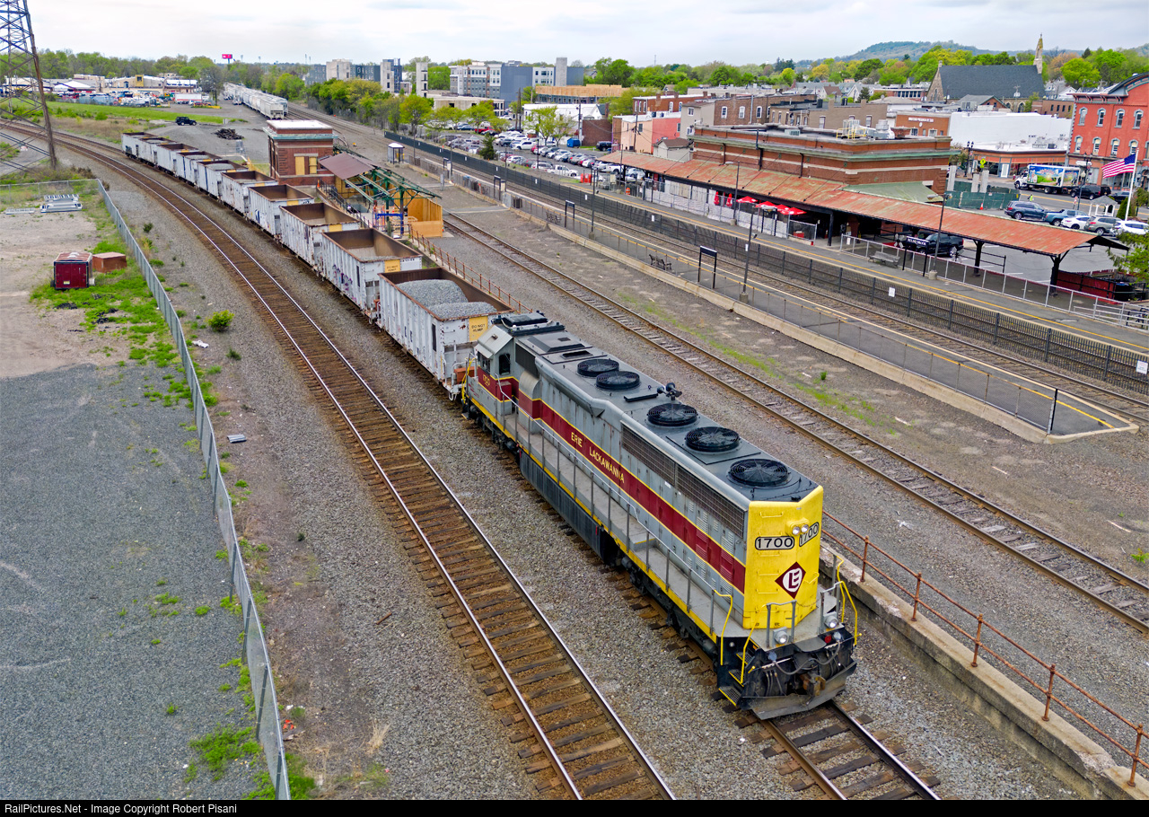 | Lately it seems Norfolk Southern's Erie Lackawanna heritage unit is captive to various yard duties in the North Jersey terminal area. So it was an unusual treat to have 1700 assigned to work train OI-95 on the Lehigh Line in late April. This short ballast train spent several days working between CP Bound Brook and CP Port Reading Jct. Here the conductor is in position on the hind end waiting for permission to shove west for another day's work. NJ Transit's Bound Brook station provides a backdrop. Note that the eastbound platform is being rehabilitated and the adjacent waiting room will once again serve the public after decades of disuse. |