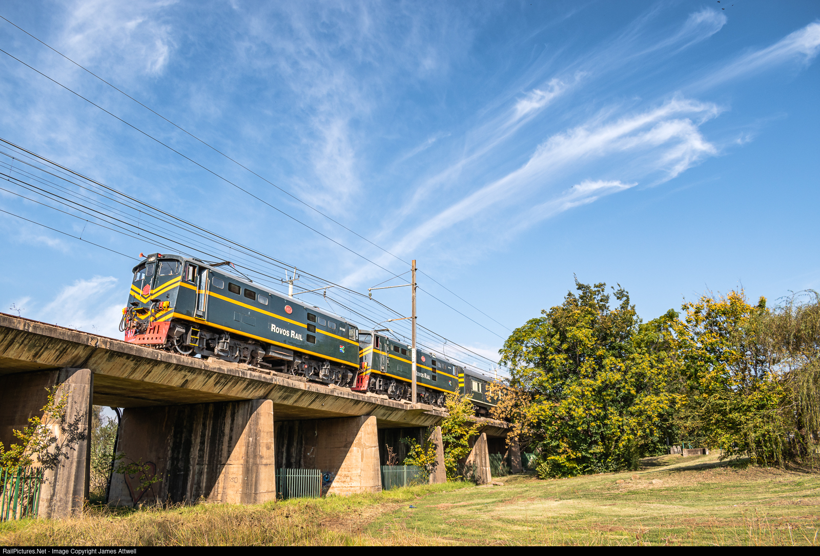 On this chilly winter morning, the majestic Rovos Rail makes its way northward across the Moorivier in Potchefstroom, South Africa, pulled by two vintage class 5E1 electric locomotives.