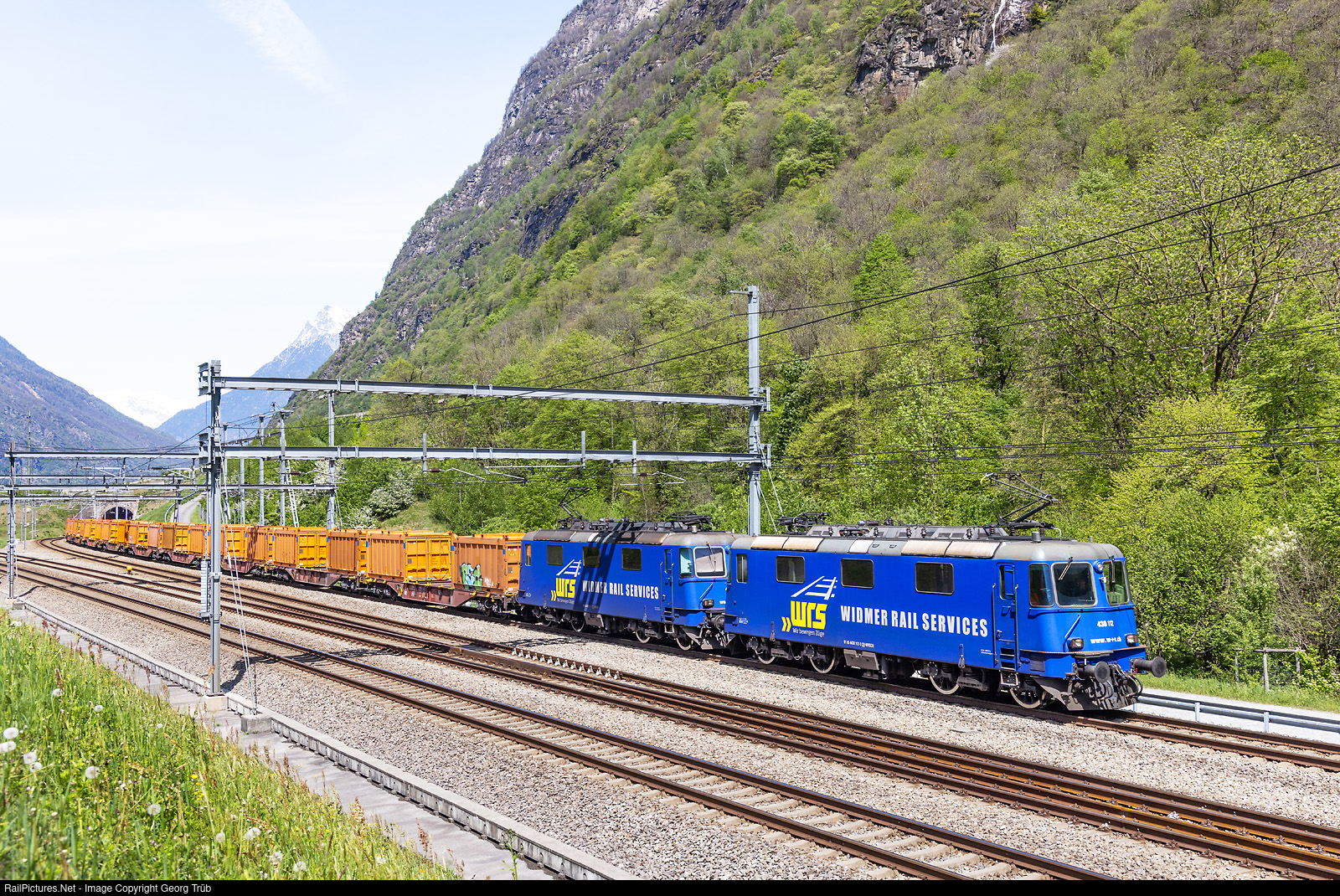 | Locomotives Re 430 # 112 and # 111 of the WRS (Widmer Rail Serices AG) pull the southbound intermodal train 40881 from Neuwied/Germany via Basel Badischer freight yard via Gotthard and Ceneri Base Tunnel to Chiasso-Dinazzano Scalo/Italy, between Biasca and Osogna-Cresciano, at the Giustizia junction. The train is transporting clay from Germany to Italy. |