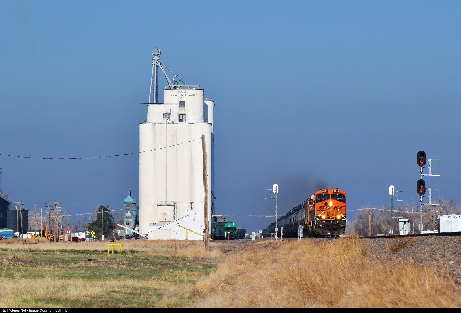 | BNSF 8354 (ES44C4) leaves storm clouds behind as it heads east on the Brush Sub, passing the large silo in Roggen, Colorado.