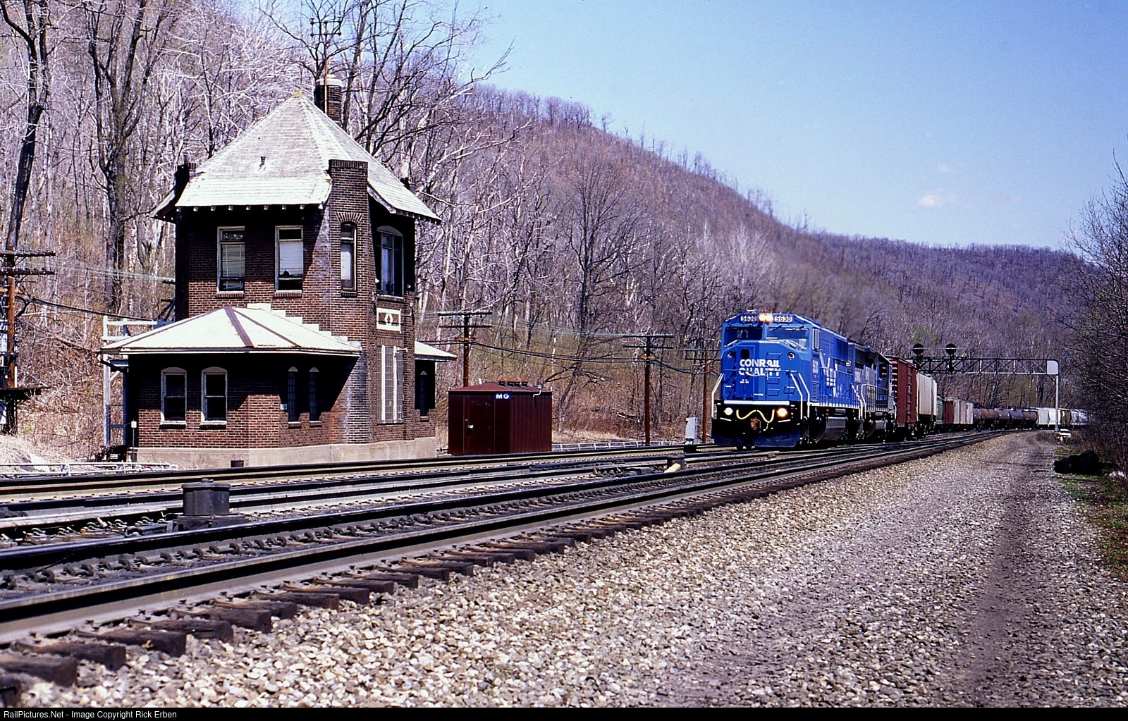 The distinctive MG Block Station was still an open office at this time as No.3 track was closed west of this point account work on the tunnels at Gallitzin. It's SD60I 5630's birthday month as it was just recently built in Altoona and looking great in its Conrail Quality colors as it leads one the daily parade of manifests. Fuji Velvia.