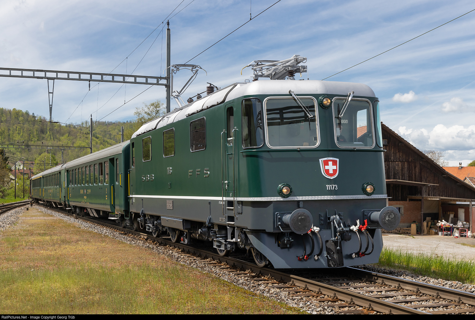 | For television recordings for SWR Eisenbahn-Romantik, extra trains ran exclusively with green rolling stock as was common at SBB decades ago. The locomotive Re 4/4 II # 11173 pulled the second class standard cars type I B # 50 85 20-33 654-8 and B # 50 85 20-35 362-6 (former GFM/TPF), the first class standard car type I A # 50 85 18-33 524-7 and the baggage car D # 50 85 92-33 116-1. All vehicles (exept B # 362) were formerly owned by SBB and now belong to the association DSF (Depot und Schienenfahrzeuge Koblenz). Train 32073 from Bad Zurzach to Eglisau passes through Rekingen station. |