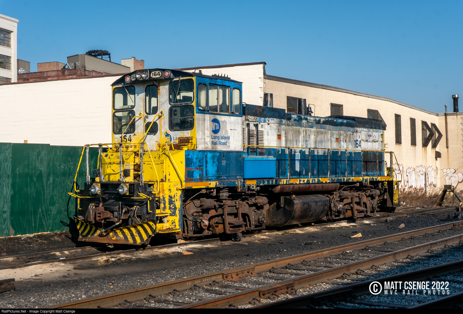 Long Island Rail Road (LIRR) MP15AC no. 164 (EMD, 1975-1984) is seen idling on a siding near Long Island City Station. Unlike most of the rail road's other MP15AC locomotives, this one is still wearing a blue, yellow, and white paint scheme from the early 2000s - though it is looking quite worse for wear!