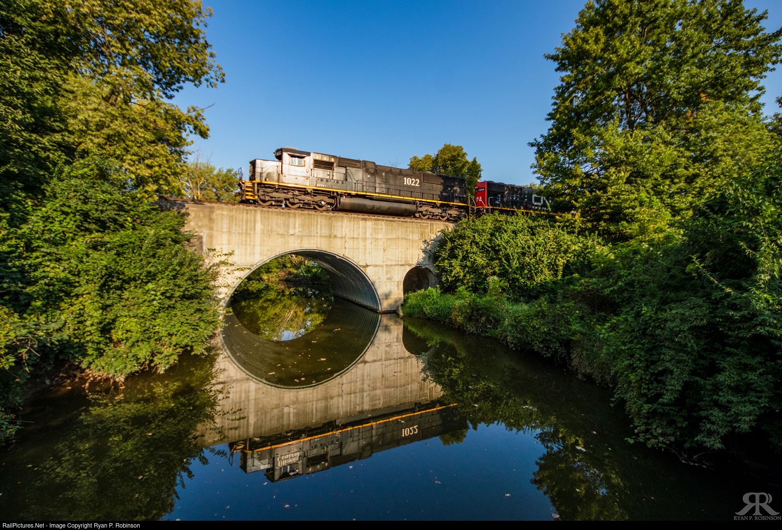 | The early morning light pierces the cab of the veteran Illinois Central SD70 hustling A408 south across Bush Creek in Neoga, Ill. |