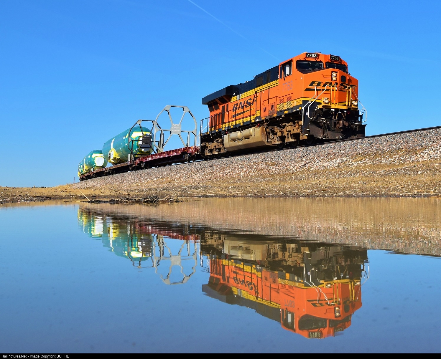 | BNSF 7763 (ES44DC) and its special cargo of three Boeing fuselages cast a reflection in a pond next to the track as it runs between Keenesburg and Roggen, Colorado on the Brush Sub.