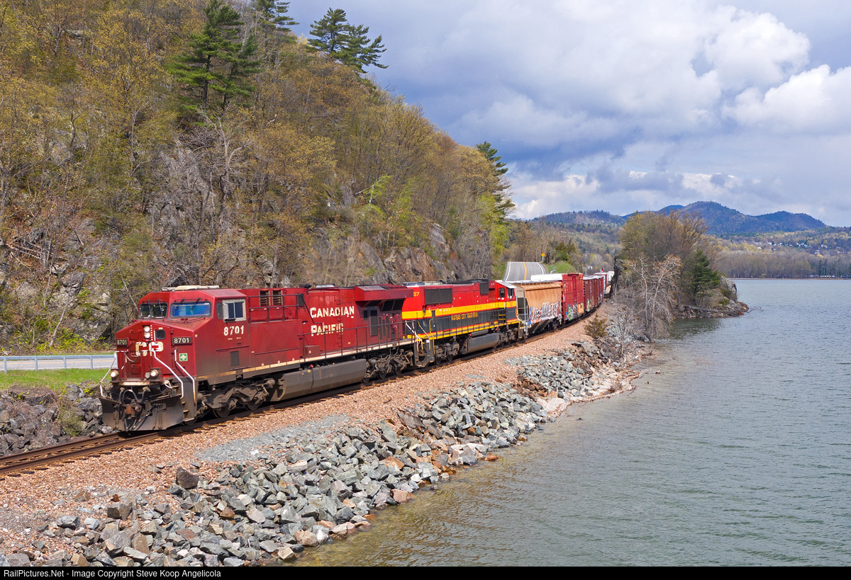 | Spring along the big lake as CPKC train 228 rolls through Port Henry with a CP/KCS combo representing the "new" railroad. CP 8701, KCS 3937 |