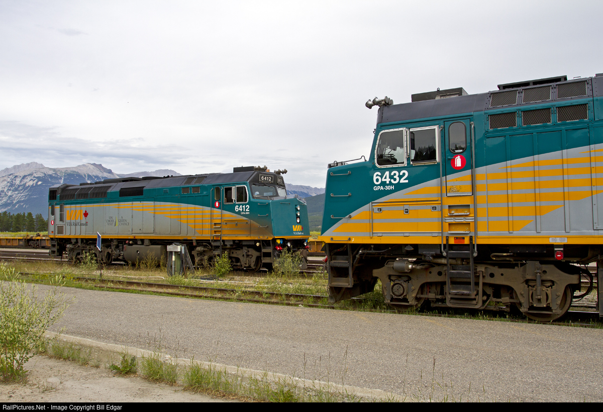 | During an hour long stop at Jasper, VIA 6412 will be picked up and added to the Canadian to dead head it east for servicing. VIA 6432 is the lead unit on the passenger train. |