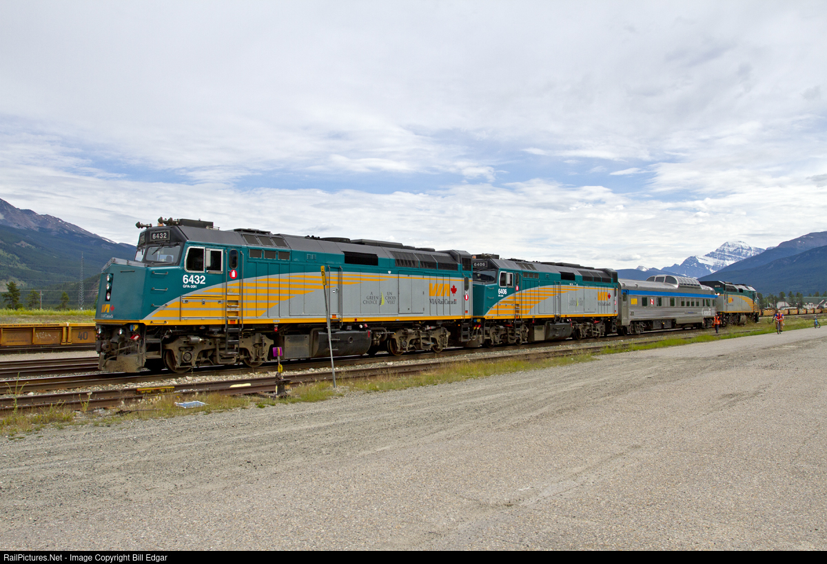 | During an hour long stop at Jasper, VIA 6432 picked up VIA 6412 and added it to the Canadian to deadhead it east for servicing. The train also had a deadheading dome observation tucked behind the two lead locos. |