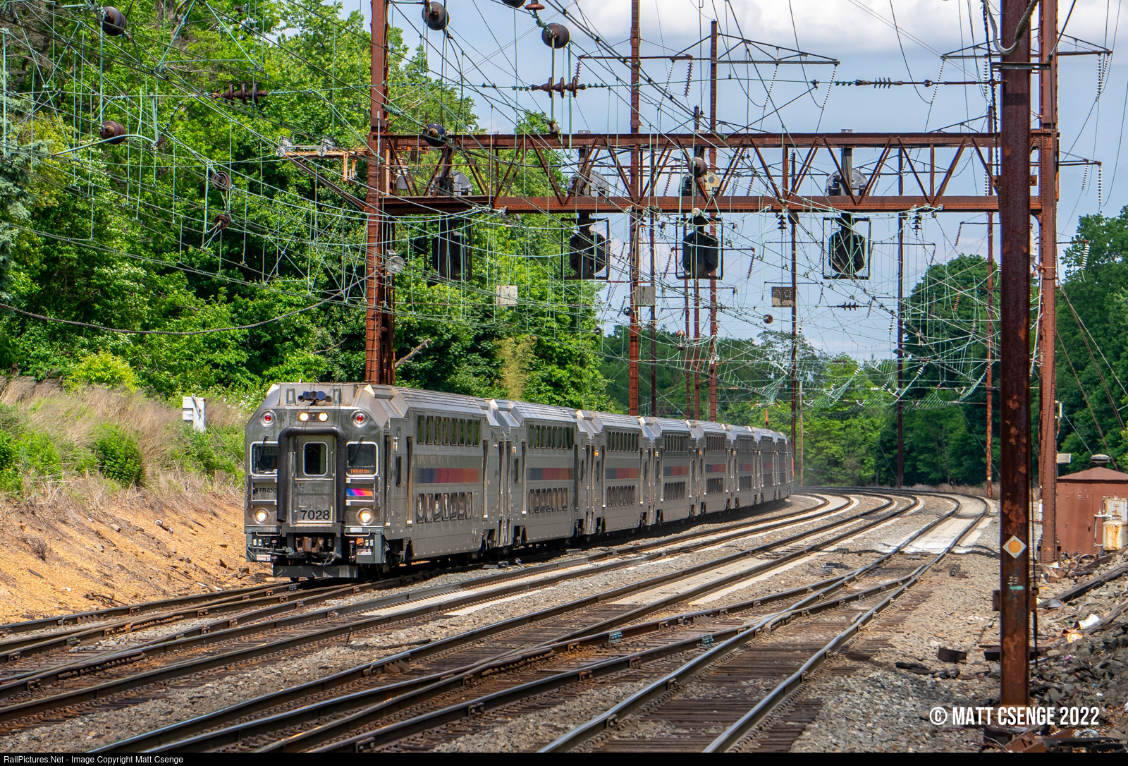 NJ Transit MultiLevel Coach 7028 (Bombardier, 2006-2010) is seen leading a Northeast Corridor Line train towards Metuchen Station. |