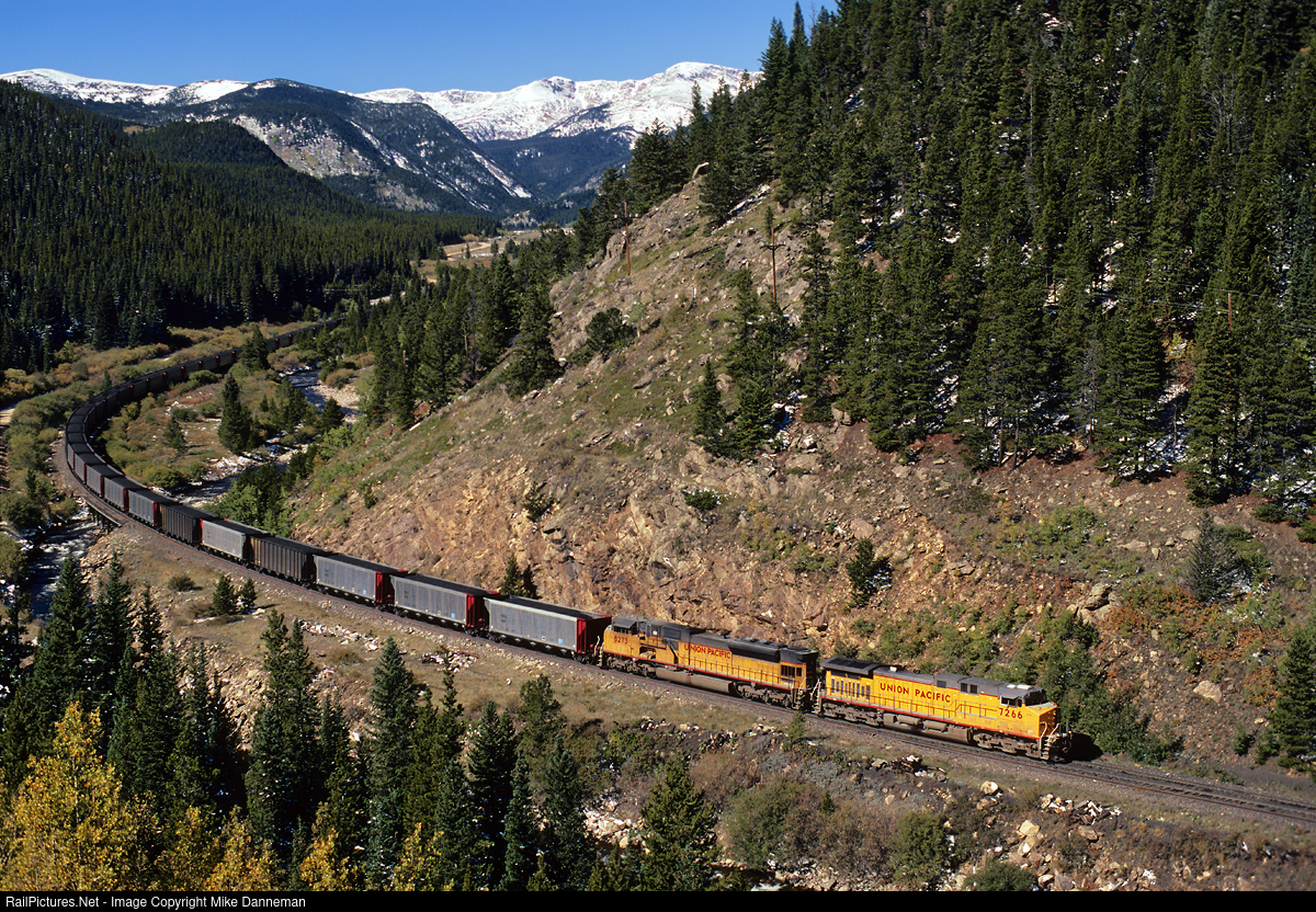 An eastbound Union Pacific coal train heads downgrade through Tolland, Colorado, on the sunny morning of September 25, 2000.