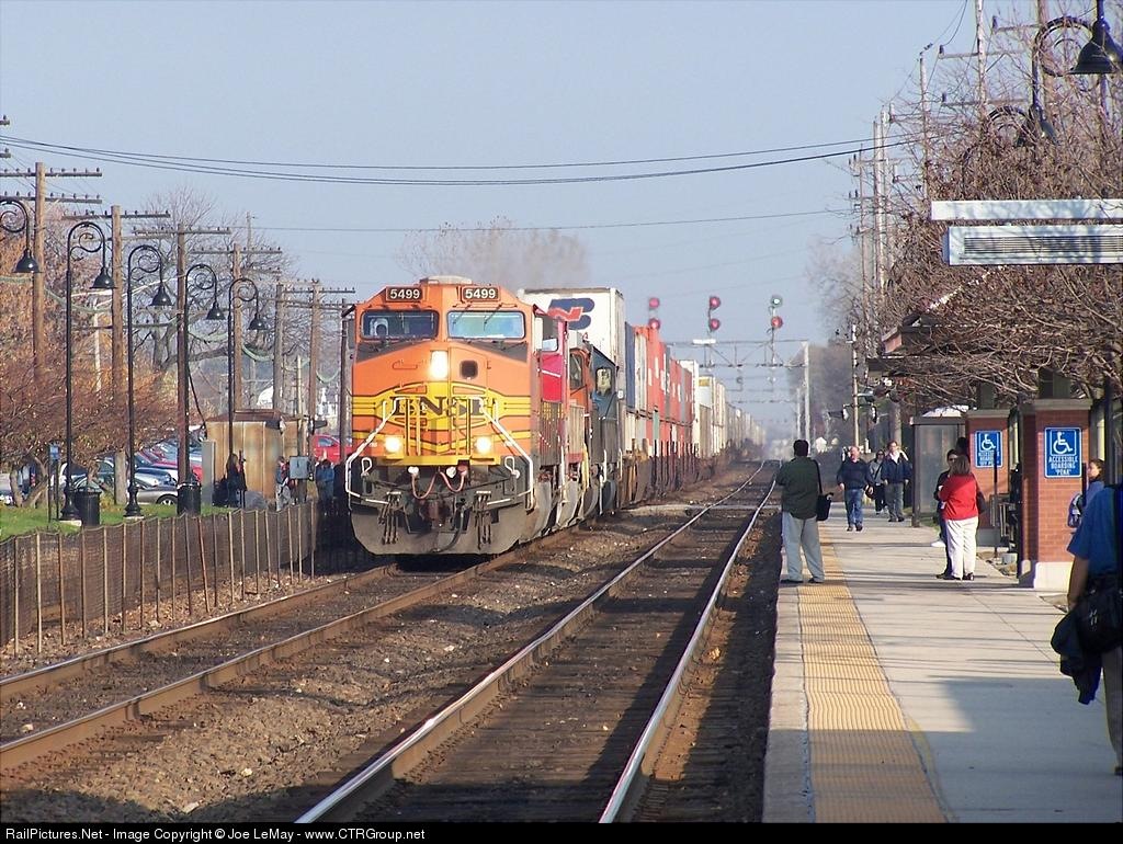 | Evening inbound commuters have nothing better to do but watch this intermodal roar through town...Of course probably none of them know that there is an H2 Dash 9 leading, an ATSF Dash 9 after that, then an H1 SD40-2 and an Oakway SD60. |