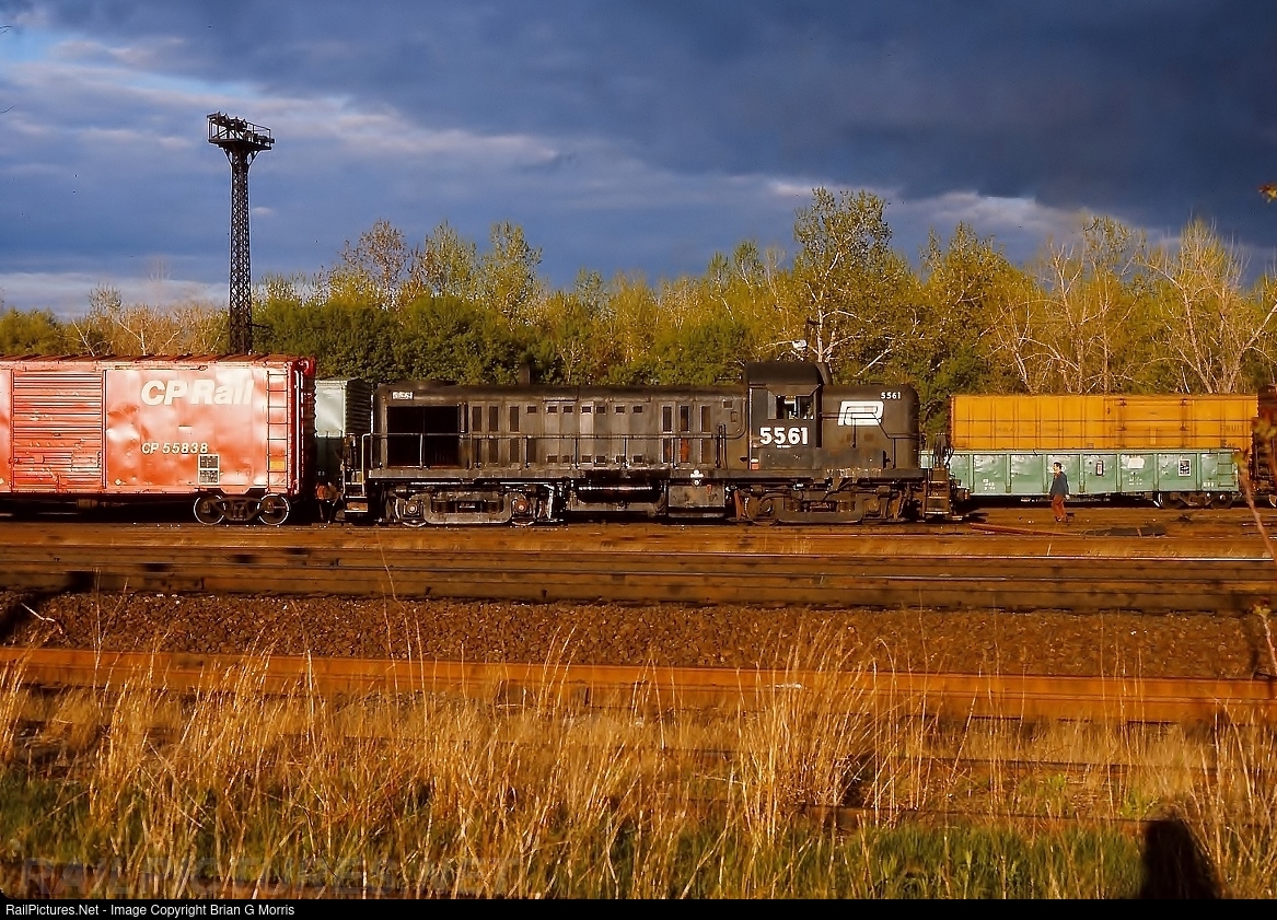 | A Penn Central Alco RS3 works the yard at Providence RI as the suns last rays break through the storm clouds near sunset in May 1976 |