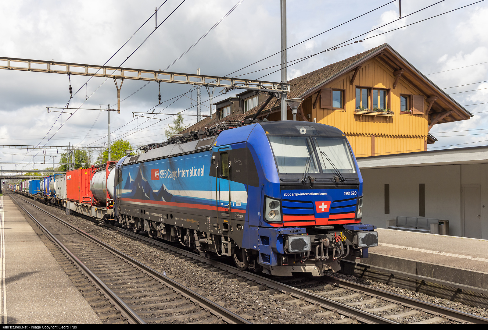 | Siemens "Vectron" 193 # 520 "Diveria" of the SüdLeasing Gmbh, rented to SBB Cargo International, is running through Mumpf with the southbound Hupac intermodal train 43037 from Ludwigshafen via Bözberg-Gotthard Base Tunnel-Luino to Gallarate (Busto Arsizio Terminal). |