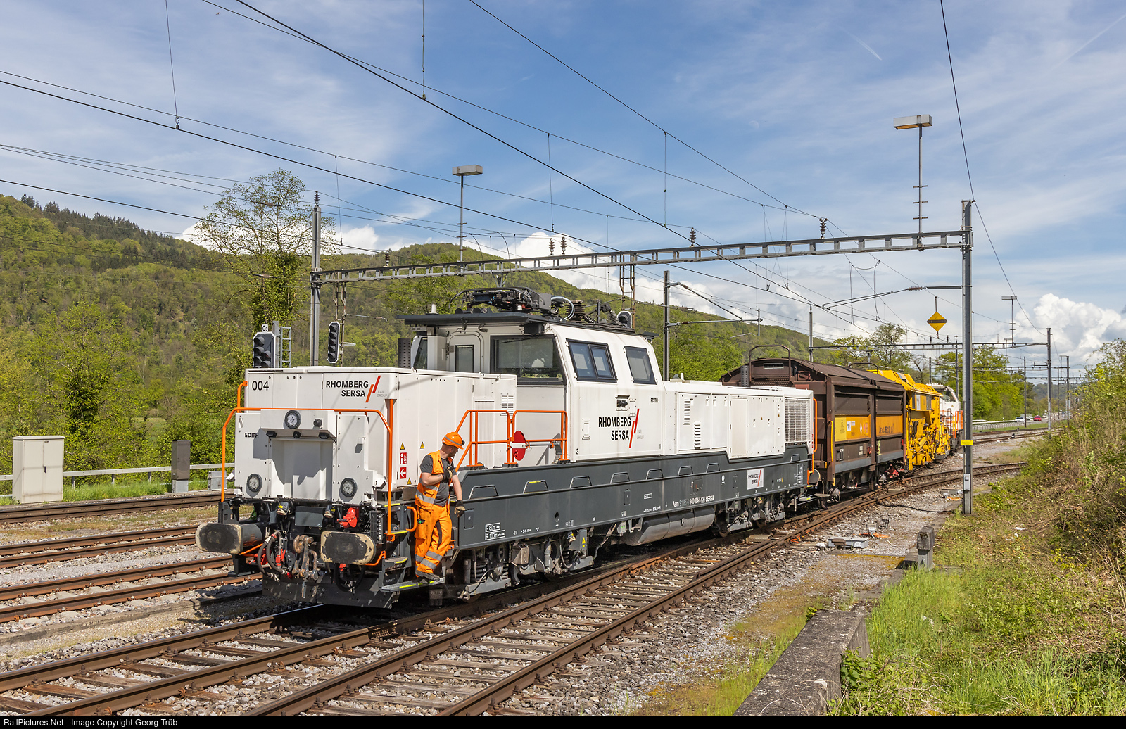 Shunting in Rekingen station. The dual mode electro/diesel locomotive Aem 940 # 004 "Edith" of the SMG (Sersa Machineller Gleisbau, part of the Rhomberg/Sersa group), a tools car and a tamping machine are moved by diesellocomotive Am 843 # 153 in the rear. The Aem 940 # 004 was built by Alstom (Prima H4) in 2018 for the SBB, but now taken over by Sersa in 2021, together with sisters Aem 940 # 001 to # 003, and # 005. The power of the H4 locomotives is 2000 kW from the overhead wire and 900 kW in diesel mode.