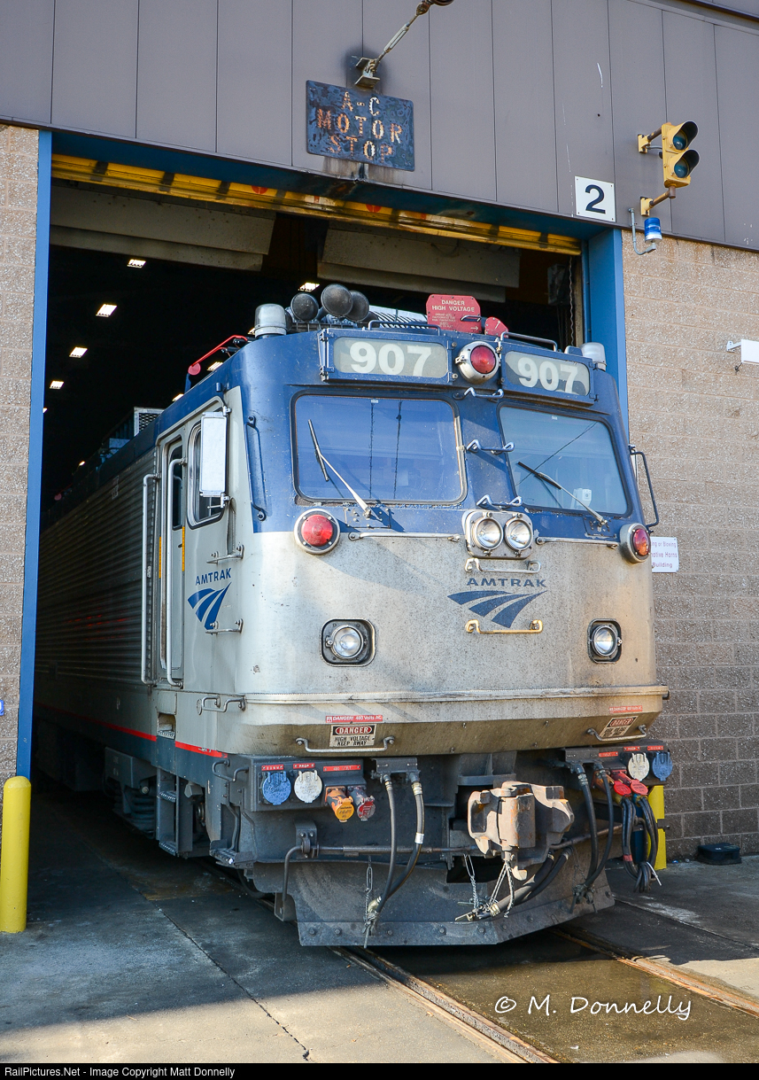 | Not all that long ago, AEM-7s were common around the NEC. 907 peeks out from the Ivy City shop. |