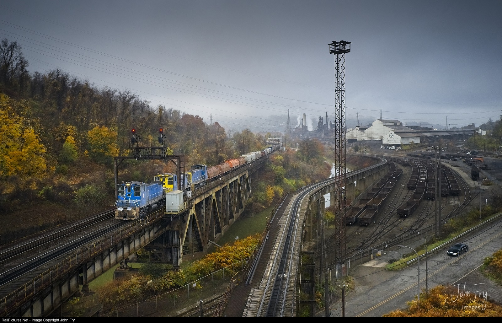 | You know when the skies are ready to open up. Luckily, the 15 job arrives before the storm and brings coil cars past US Steel's Edgar Thompson works. This interlocking is guarded by a signal bridge still holding PRR position light signals, with new color light signals in front of them. The conductor has just dropped off as the train will pull past him where he will then hop on the caboose and protect the shove back to the CSX interchange at Cliff St. Im sure he was anxiously hoping the caboose on the tail end makes it to him before the rain. |