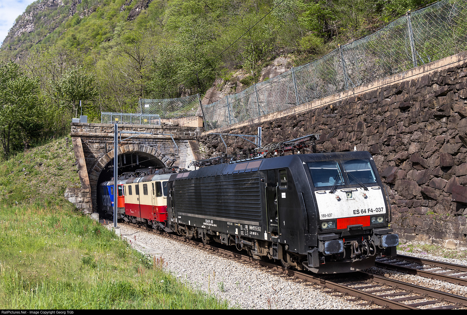 Three locomotives running light as train 99412 from Chiasso freight yard to Basel Bad Bahnhof, entering the Crocetto tunnel between Osogna-Cresciano and Biasca, shot from the rear. Siemens ES 64 F4-037 (189 # 037) of Dispolok, rented to Medway Italia S.r.l., Genova and not allowed to run in Switzerland in front of a train, Re 4/4 II # 11393 (Re 421 # 393) of the IRSI AG in the red/cream TEE colors and Re 420 # 268 of the Sersa/Rhomberg group, former SBB Cargo (pulling the train together with # 11393 in multiple control).