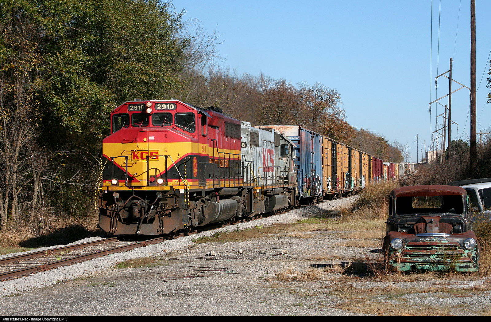 The KCS Fort Smith Dodger passes an old Dodge pickup truck that has seen better days on its trip back to Heavener Oklahoma.