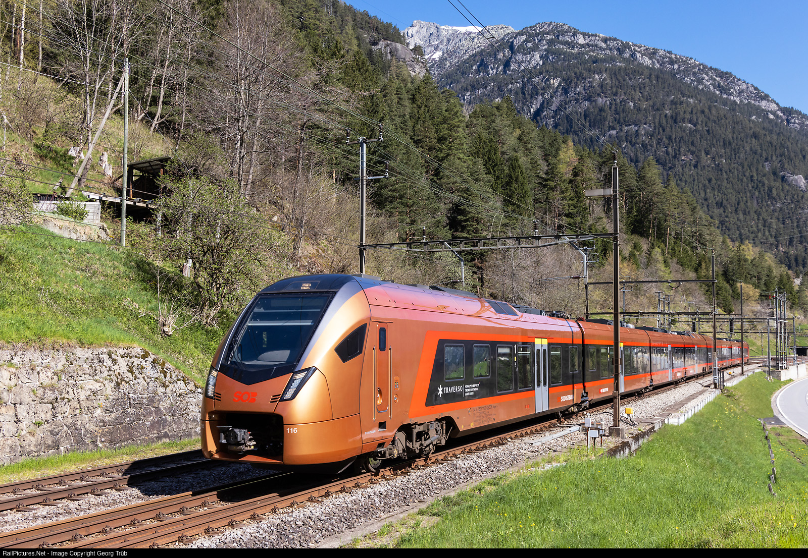 | "Traverso" train RABe 526 # 116/216 of the Südostbahn (SOB) is running the IR 2418 of the line IR 46 TRENO GOTTARDO from Locarno and Bellinzona over the Gotthard mountain line to Arth Goldau-Zug-Zürich, at Wassen. |