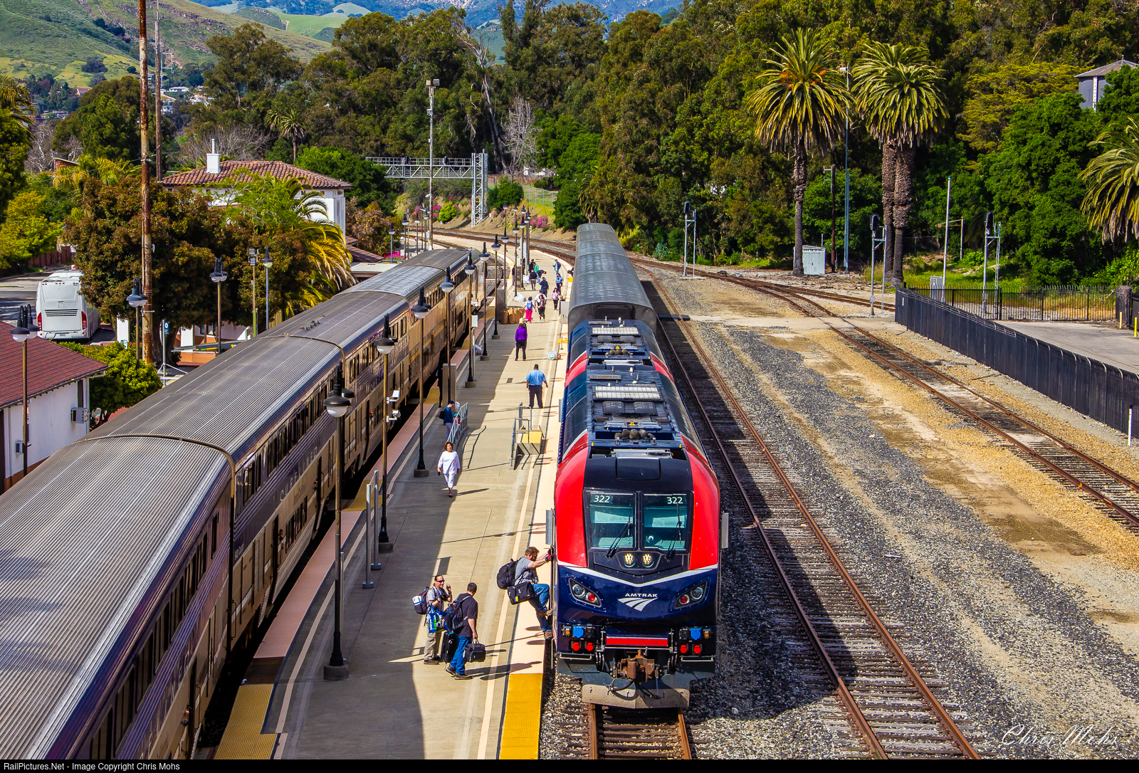 | Crew change in San Luis Obispo for Amtrak No. 14. the southbound Coast Starlight to Los Angeles. The Starlight has 2 new Siemens ALC-42 No.322 and No 319 leading a short 5 car train. A Pacific Surfliner will lead the Late No 14 down the coast. |