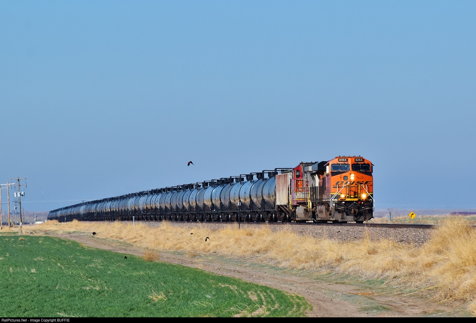 BNSF 8354 (ES44C4) leads an oil can train east on the Brush Sub through Fort Morgan, Colorado.