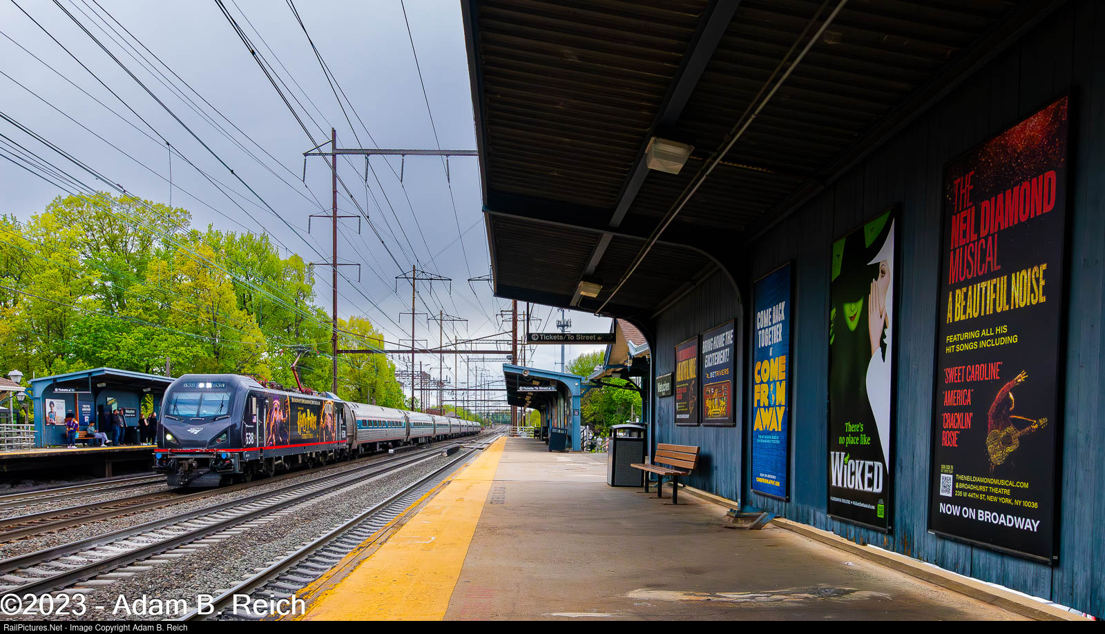| Broadway Ads Stage Left and Right: One of four Amtrak ACS-64s wrapped in ads for Harry Potter and the Cursed Child on Broadway approaches a line of ads for other Broadway shows on the platform at NJ Transit's Metuchen station on Wednesday, May 3, 2023. |