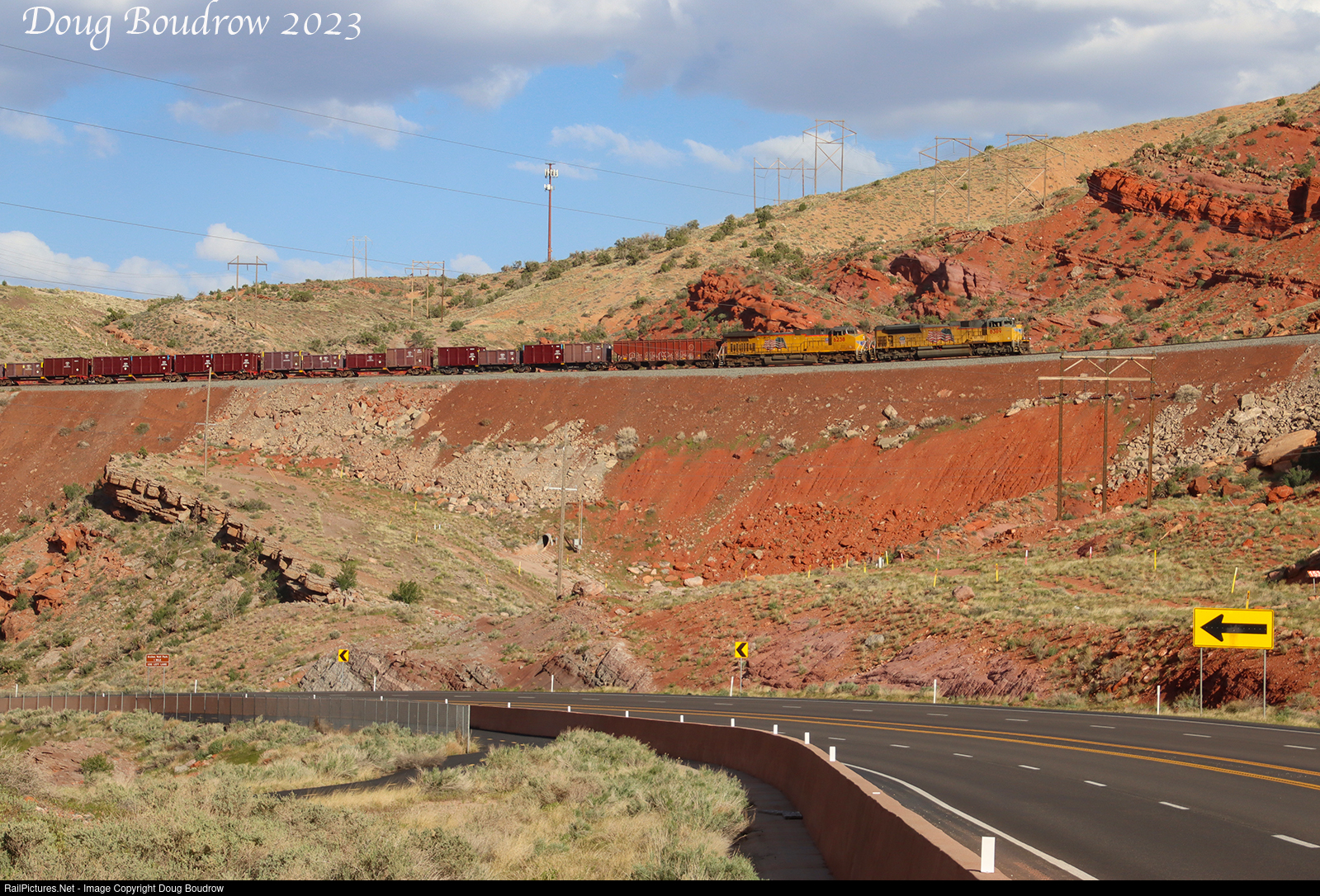 | Starting in 2009 the United States Department of Energy began a project to move the nation's largest pile of uranium tailings located just outside Moab. The tailings are a byproduct of the former Atlas Uranium Mine, the richest vein ever discovered at the time in the nearby La Sal Mountains. The mine operated from 1956 to 1988. The concern today is the long-term contamination from the tailings to the nearby Colorado River. The byproducts are being moved North to a permanent disposal site near Crescent Junction. Union Pacific runs trains 5 days a week for this project. The train is seen leaving the site and is passing the entrance to Arches National Park. |