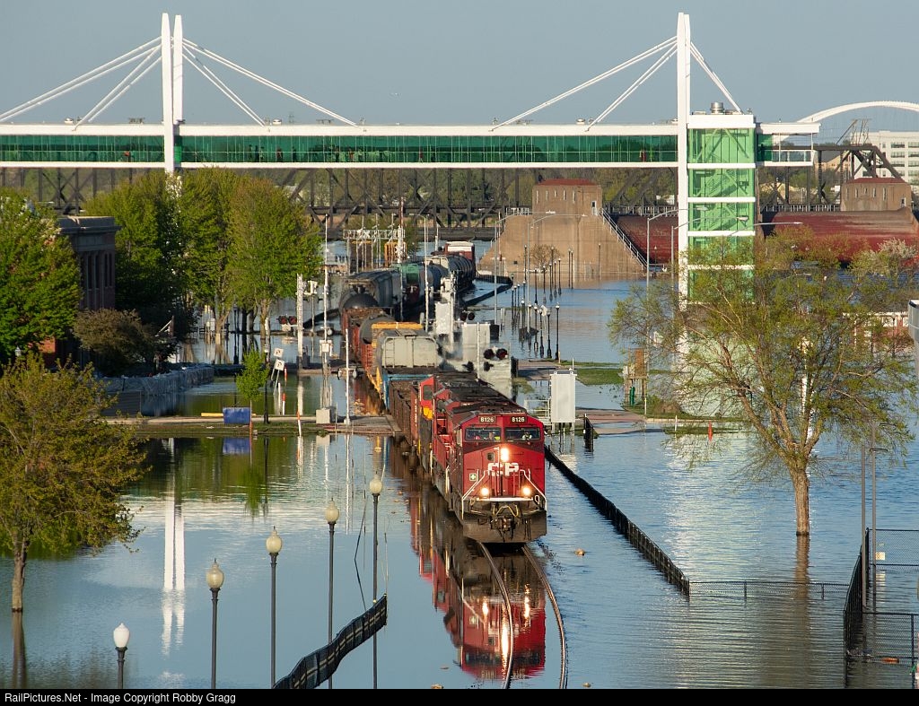CP 8126 leads CPKC 9-253 South through a flooded downtown Davenport.