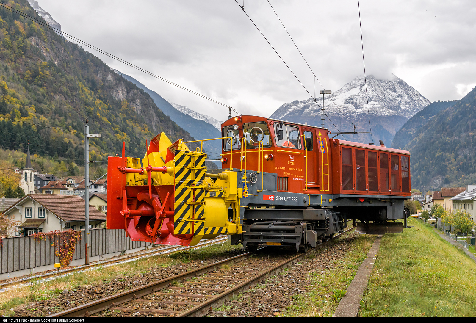 The snow blower Xrotm #96 is made ready for the winter at Erstfeld station. In the process, the rotating superstructure is turned in the direction of Göschenen. The machine arrived shortly before from IW Biel. For the transfer from Biel to Erstfeld, another locomotive was in front of it, which is why the blower was standing the wrong way round.