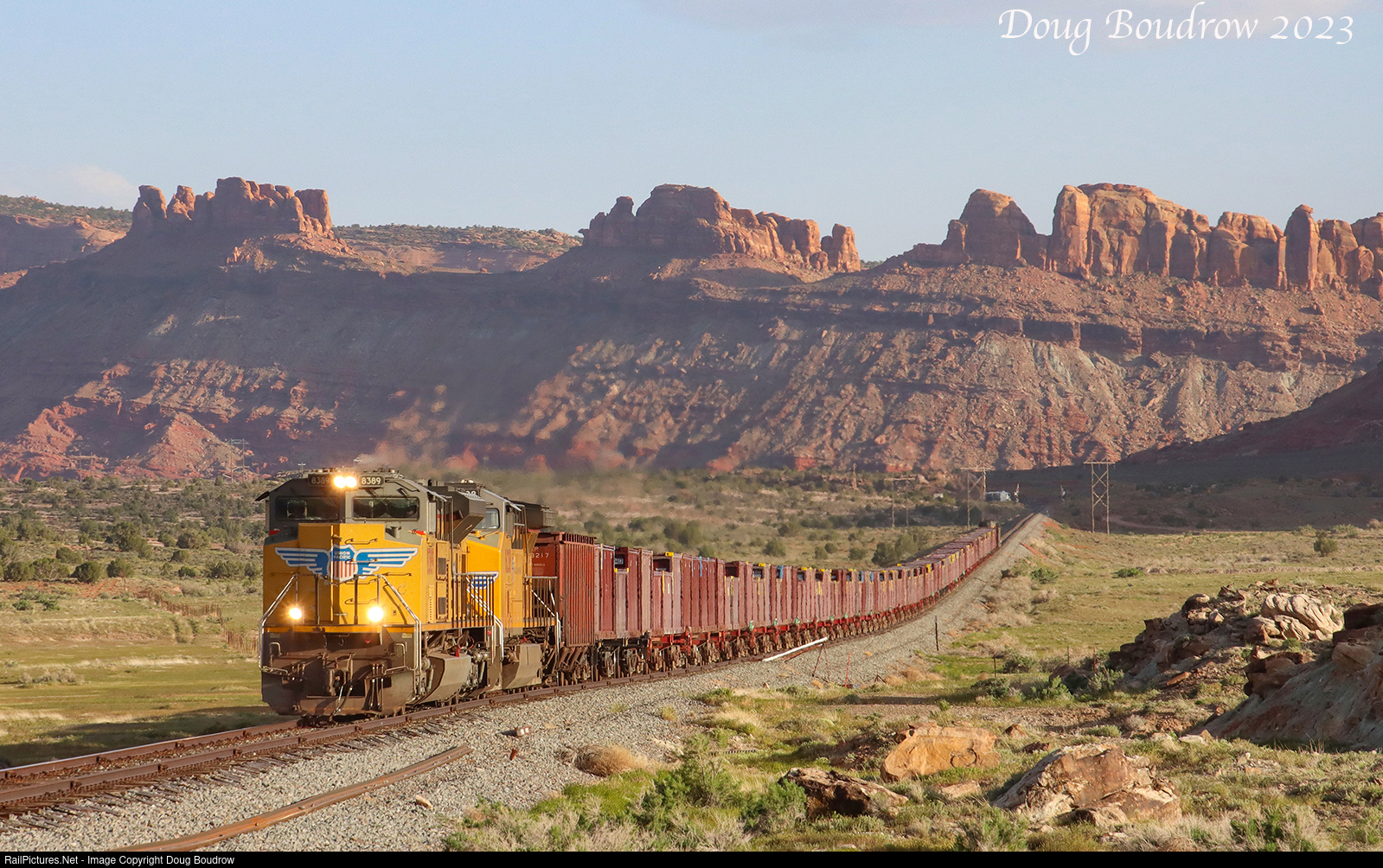 Starting in 2009 the United States Department of Energy began a project to move the nation's largest pile of uranium tailings located just outside Moab. The tailings are a byproduct of the former Atlas Uranium Mine, the richest vein ever discovered at the time in the nearby La Sal Mountains. The mine operated from 1956 to 1988. The concern today is the long-term contamination from the tailings to the nearby Colorado River. The byproducts are being moved North to a permanent disposal site near Crescent Junction. Union Pacific runs trains 5 days a week for this project. The train is seen North of Seven Mile leaving the red rocks of Moab behind.