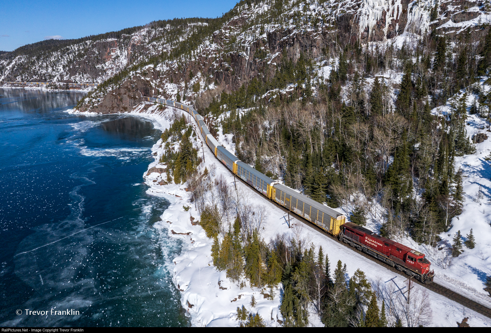 Curves, cuts, and cliffs at Cavers - high above the right-of-way the nascent snow melt atop the bluffs has frozen again overnight, giving it the look of a wax-laden candle base. Meanwhile, the ice on Superior has given way to shimmering shades of blue in the mid-morning sun, setting a dramatic scene for a long string of EB racks to navigate - CP 106 at MP 27 Nipigon Sub emerges from its first of the two bores here inching closer to its change off at Schreiber.