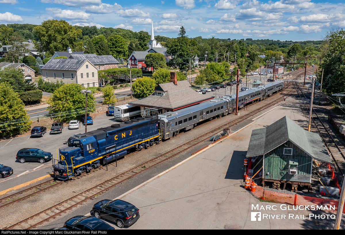 Blue Unit At The Happy Rock. Due to midday work on the Gladstone Branch, a diesel set enjoyed a long layover at the station in Gladstone, New Jersey on Friday, August 12, 2022. NJ Transit GP40PH-2 4109 (CNJ Heritage) had a shorter than usual consist with only 3 cars, which put it in a more favorable position for a shot that included both the Delaware, Lackawanna and Western freight house and passenger station.